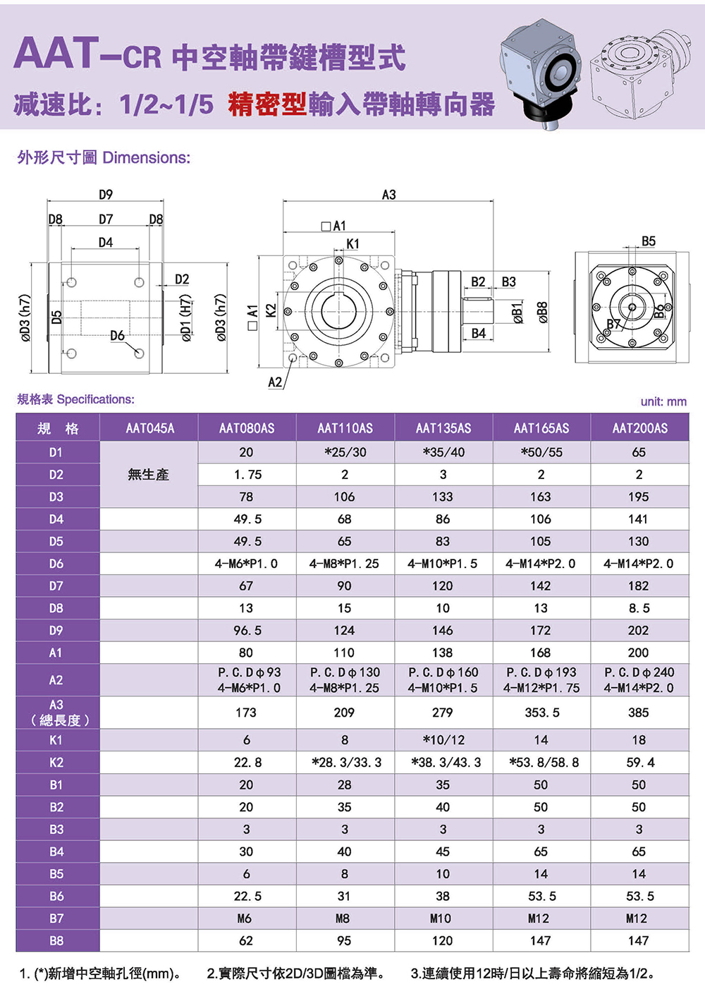 多樣化:輸出軸種類多樣化,有單出力軸型、雙出力軸型、中空軸型、中空法蘭型、中空軸錐形緊迫性、螺桿直線型、螺牙直線型。