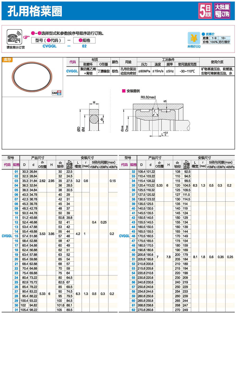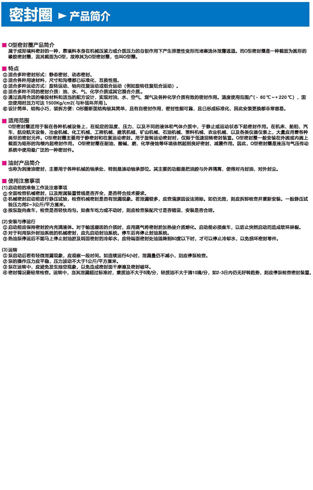 通過選用合適的橡膠材料和適當?shù)呐浞皆O(shè)計,實現(xiàn)對油、水、空氣、煤氣及各種化學介質(zhì)有效的密封作用。溫度使用范圍廣(- 60*C~+220°C) ,固定使用時壓力可達1500Kg/cm2(與補強環(huán)并用)。