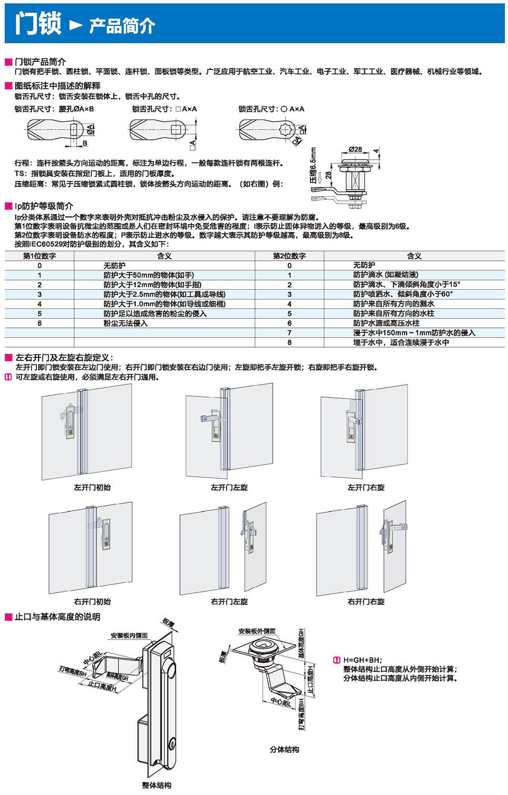 門鎖有把手鎖、圓柱鎖、平面鎖、連桿鎖、面板鎖等類型。廣泛應用于航空工業(yè)、汽車工業(yè)、電子工業(yè)、軍工工業(yè)、醫(yī)療器械、機械行業(yè)等領域。