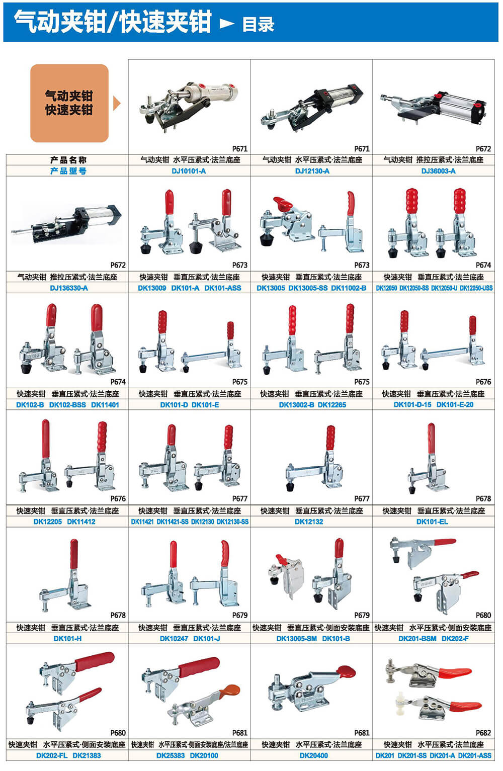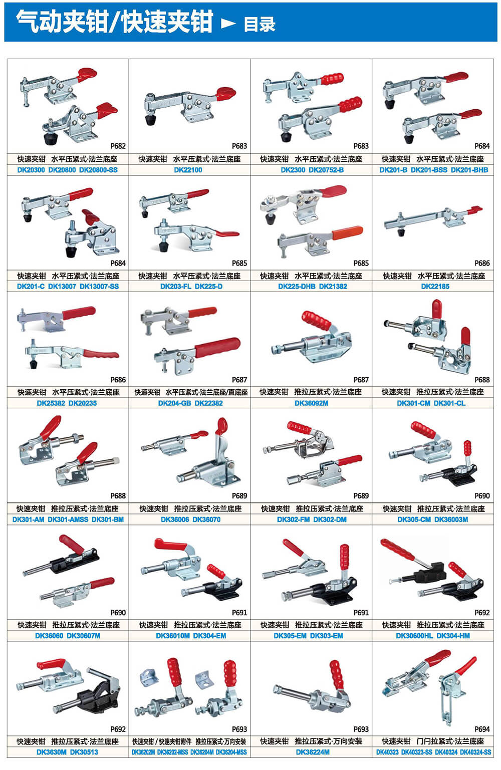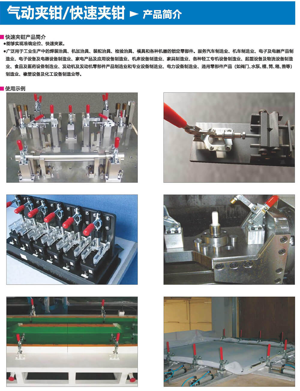 廣泛用于工業(yè)生產(chǎn)中的焊裝治具、機加治具、裝配治具、檢驗治具、機具和各種機圈的鎖定零部件。服務(wù)汽車制造業(yè)、機車制造業(yè)、電子及電器產(chǎn)品制造業(yè)、電子設(shè)備及電器設(shè)備制造業(yè)、家電產(chǎn)品及應(yīng)用設(shè)備制造業(yè)、機床設(shè)備制造業(yè)、家具制造業(yè)、各種輕工專機設(shè)備制造業(yè)、起重設(shè)備及物流設(shè)備制造業(yè)、食品及醫(yī)藥設(shè)備制造業(yè)、發(fā)動機及發(fā)動機零部件產(chǎn)品制造業(yè)和專業(yè)設(shè)備制造業(yè)、電力設(shè)備制造業(yè)、通用零部件產(chǎn)品(如閥門、水泵、槽、簡、箱、蓋等)制造業(yè)、橡塑設(shè)備及化工設(shè)備制造業(yè)等。