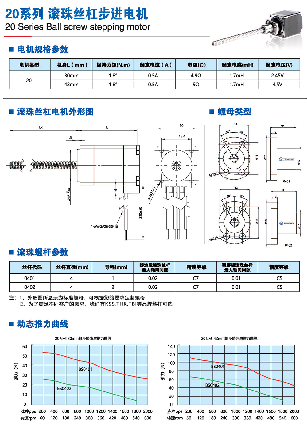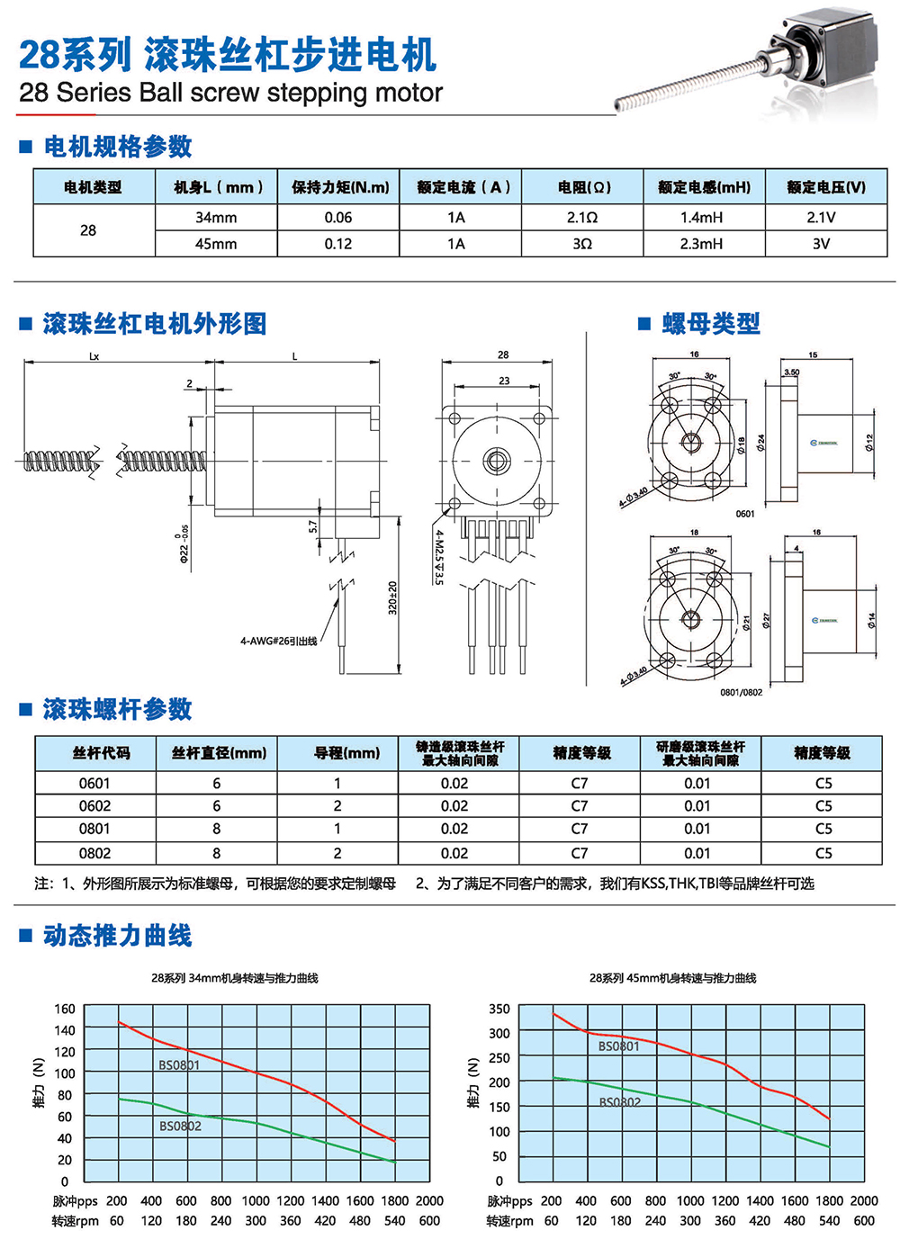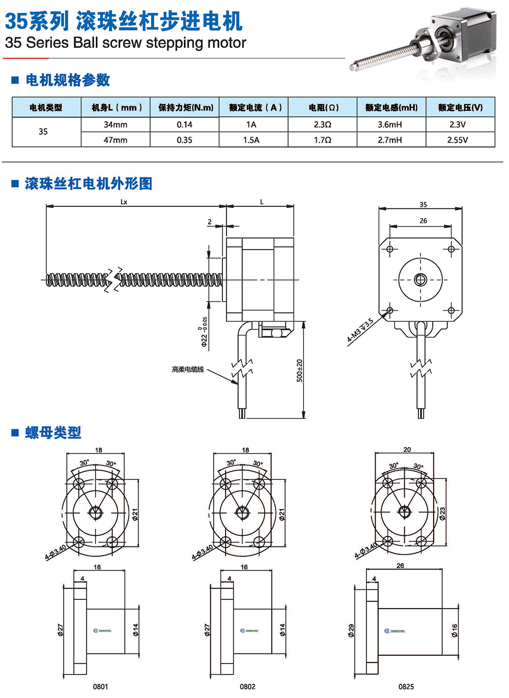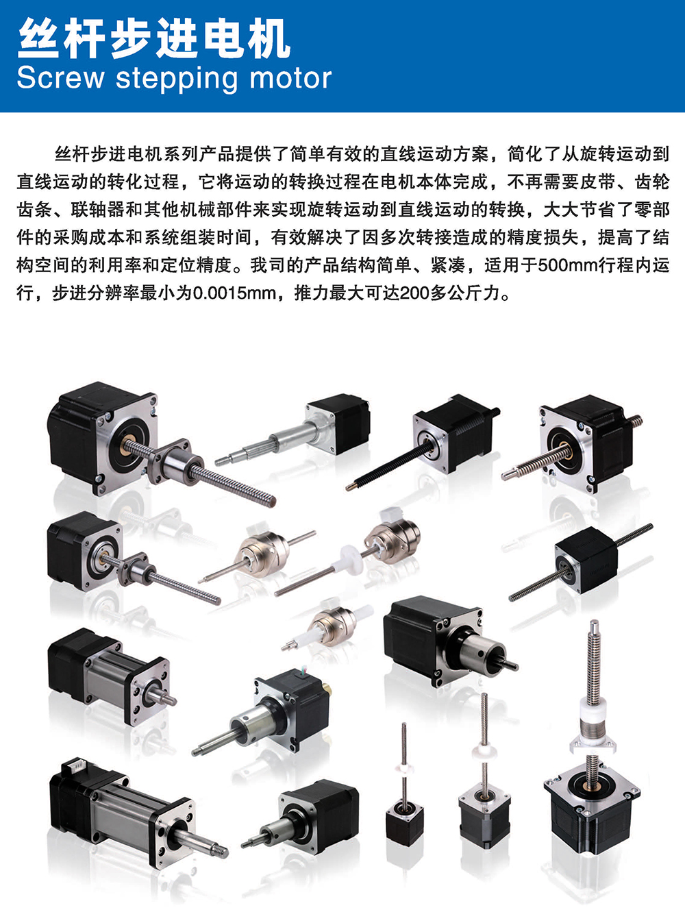 滾珠絲桿步進(jìn)電機(jī)有六種尺寸,外形尺寸從14mm至86mm,滾珠絲桿電機(jī)為外部驅(qū)動(dòng)式。 從0.005mm/步到0. 1mm/步,有多種步長可選。推力可達(dá)1600N,全系可 選配編碼器。
