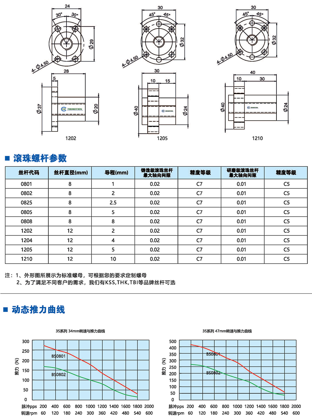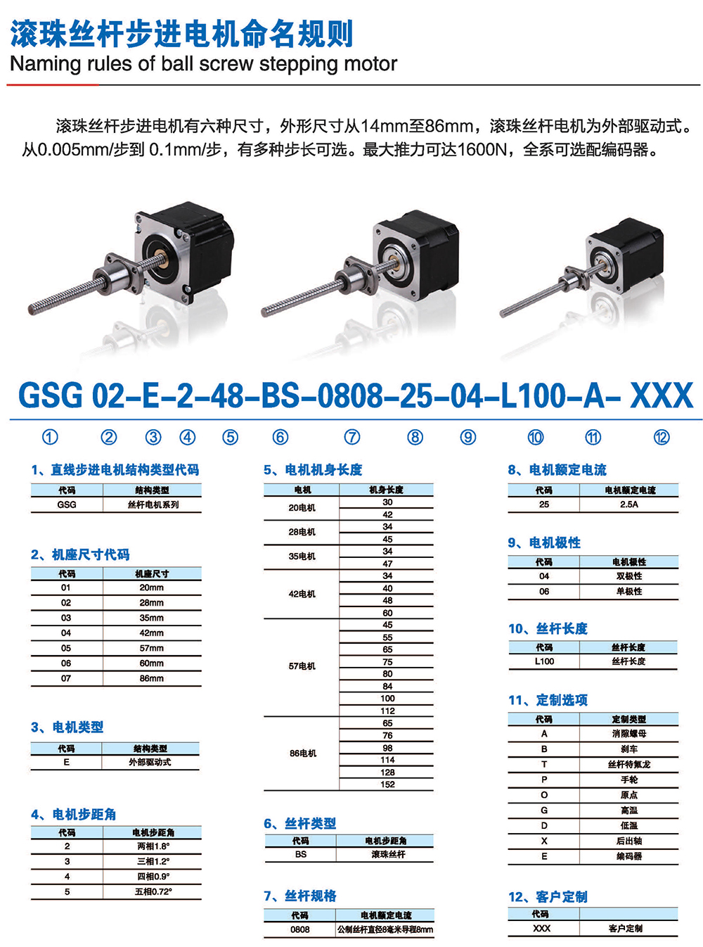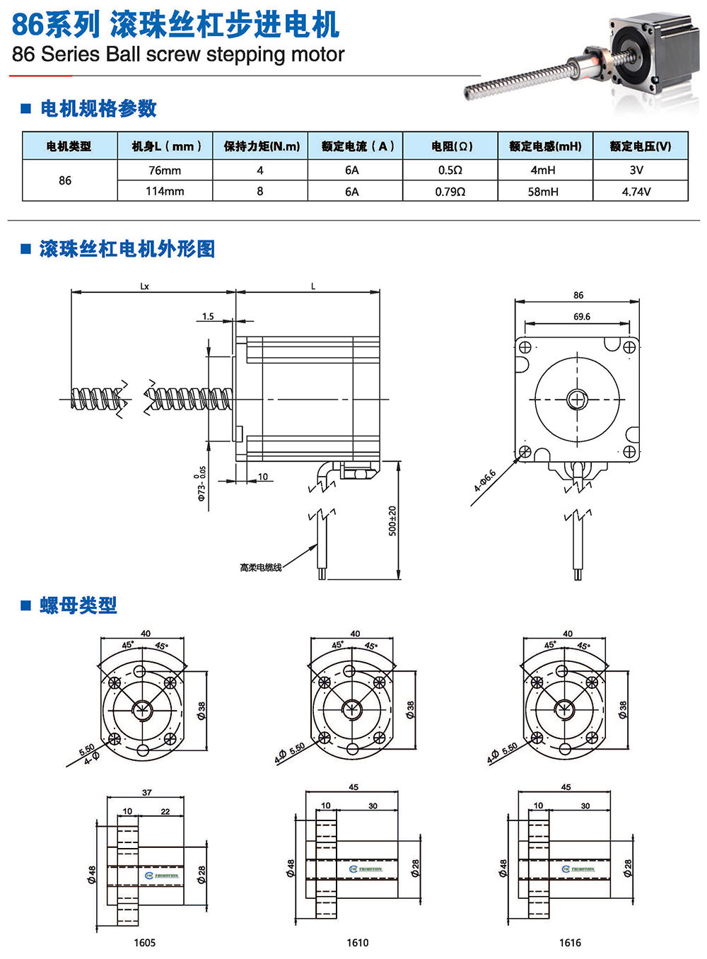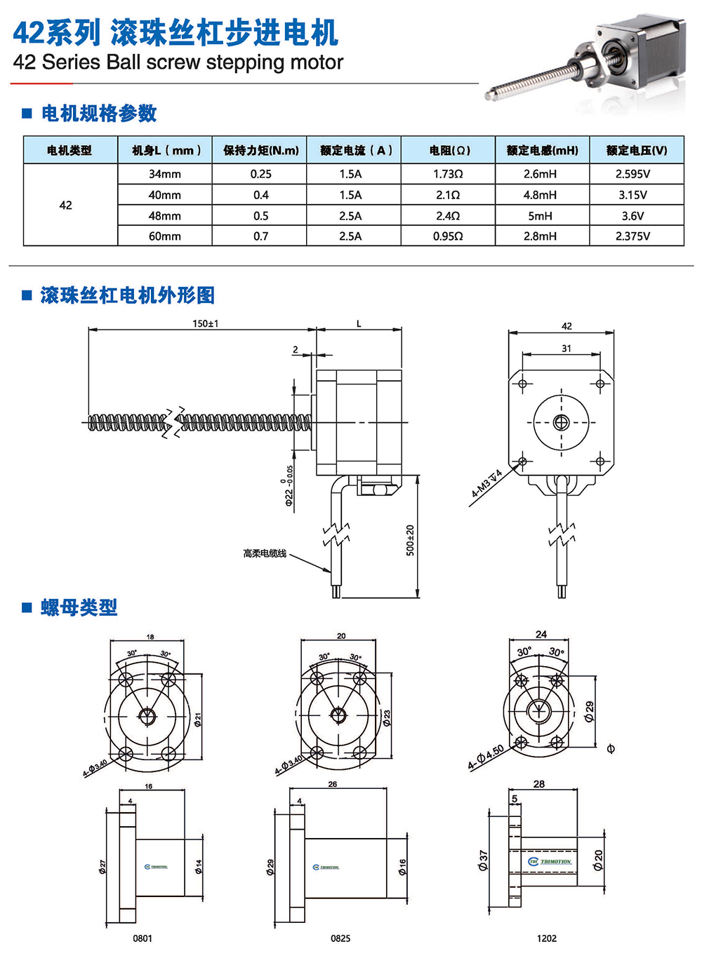 滾珠絲桿步進(jìn)電機(jī)有六種尺寸,外形尺寸從14mm至86mm,滾珠絲桿電機(jī)為外部驅(qū)動(dòng)式。 從0.005mm/步到0. 1mm/步,有多種步長可選。推力可達(dá)1600N,全系可 選配編碼器。