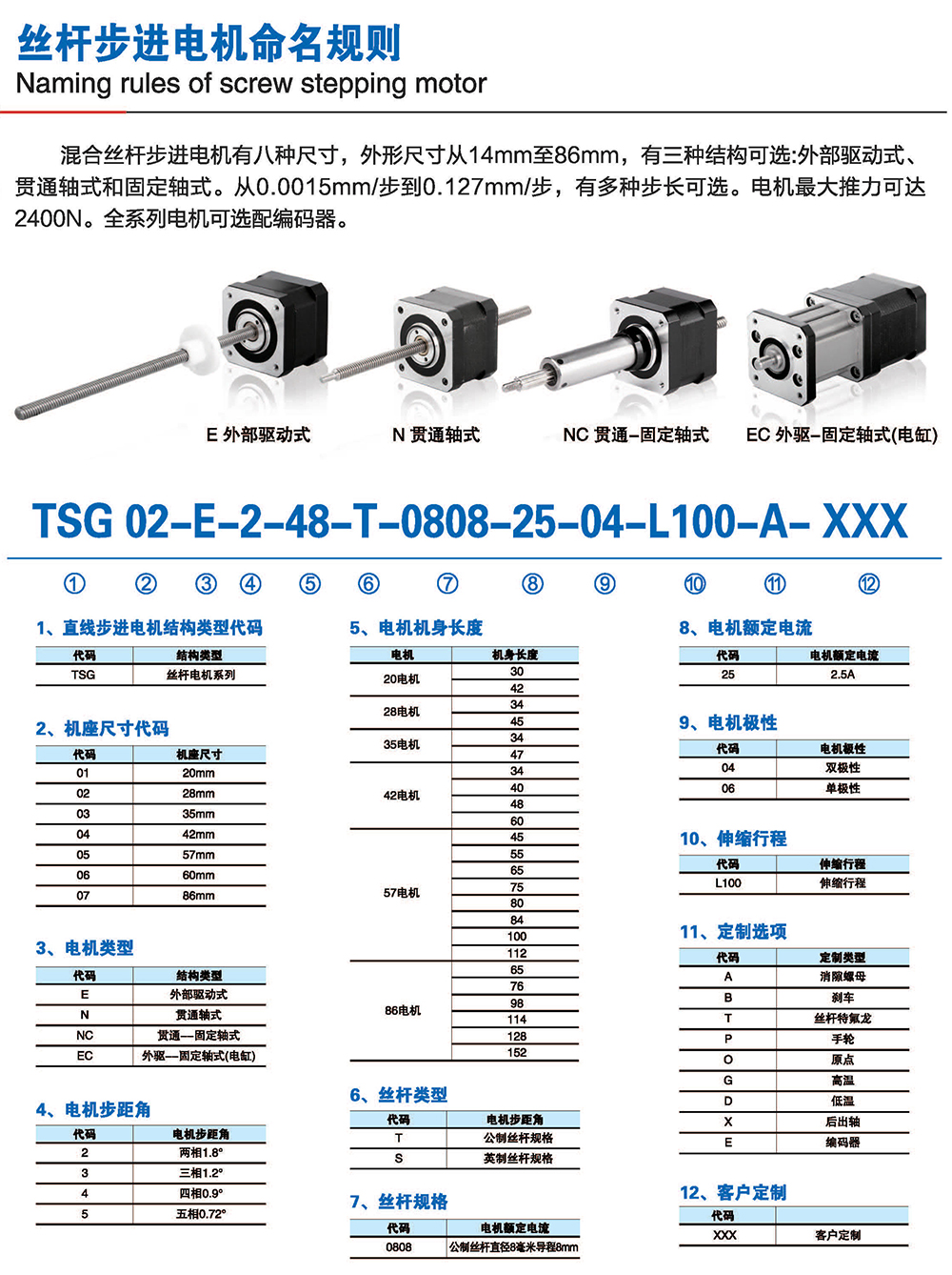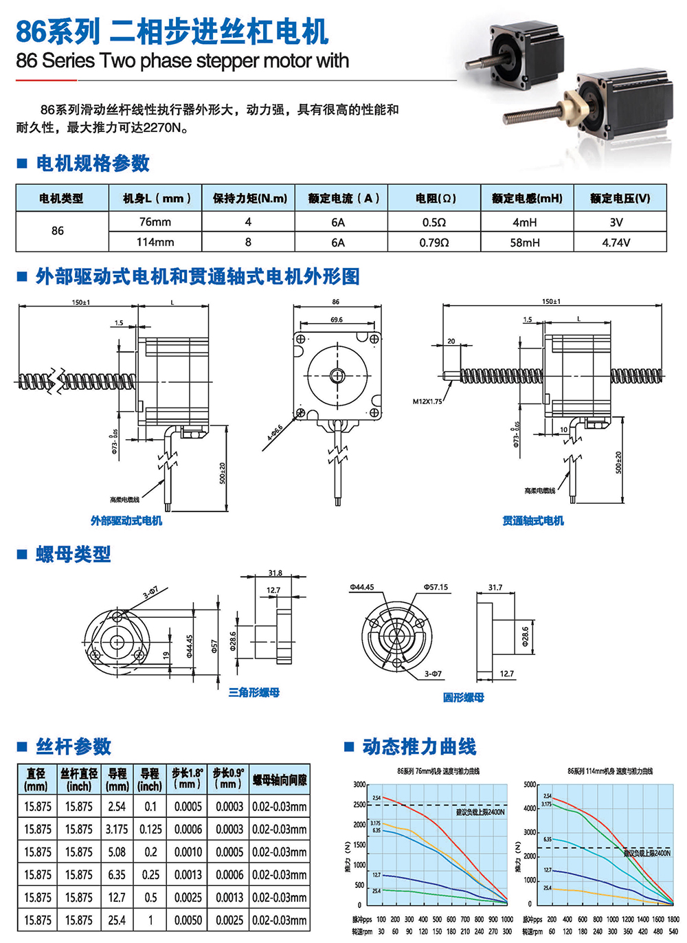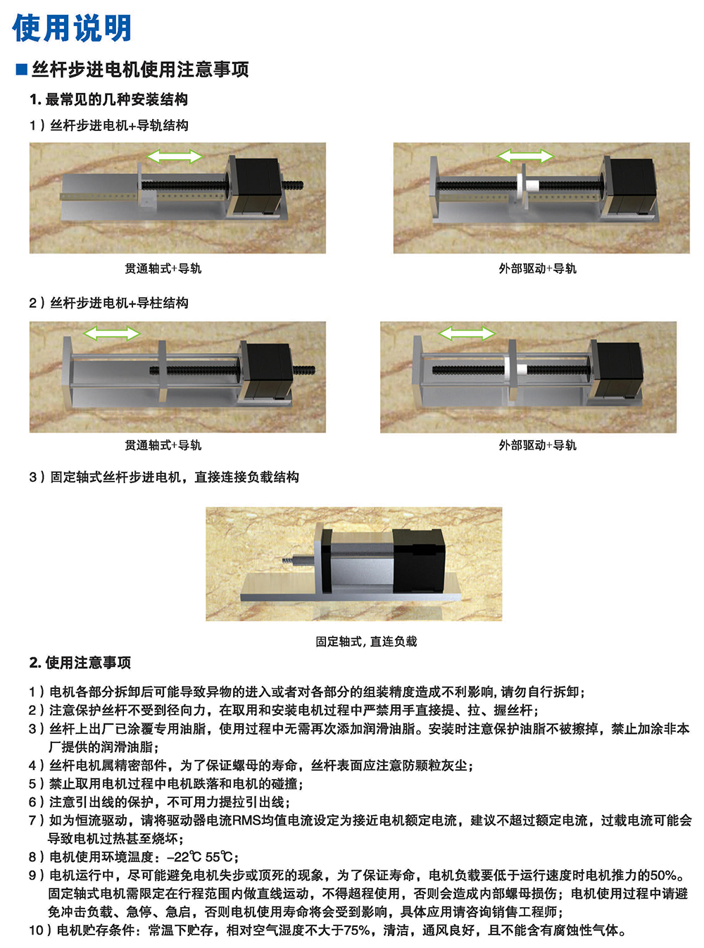 絲桿步進電機系列產品提供了簡單有效的直線運動方案,簡化了從旋轉運動到 直線運動的轉化過程,它將運動的轉換過程在電機本體完成,不再需要皮帶、齒輪 齒條、聯(lián)軸器和其他機械部件來實現旋轉運動到直線運動的轉換,大大節(jié)省了零部 件的采購成本和系統(tǒng)組裝時間,有效解決了因多次轉接造成的精度損失,提高 了結 構空間的利用率和定位精度。我司的產品結構簡單、緊湊,適用于500mm行程內運 行,步進分辨率小為0.0015mm,推力可達200多公斤力。