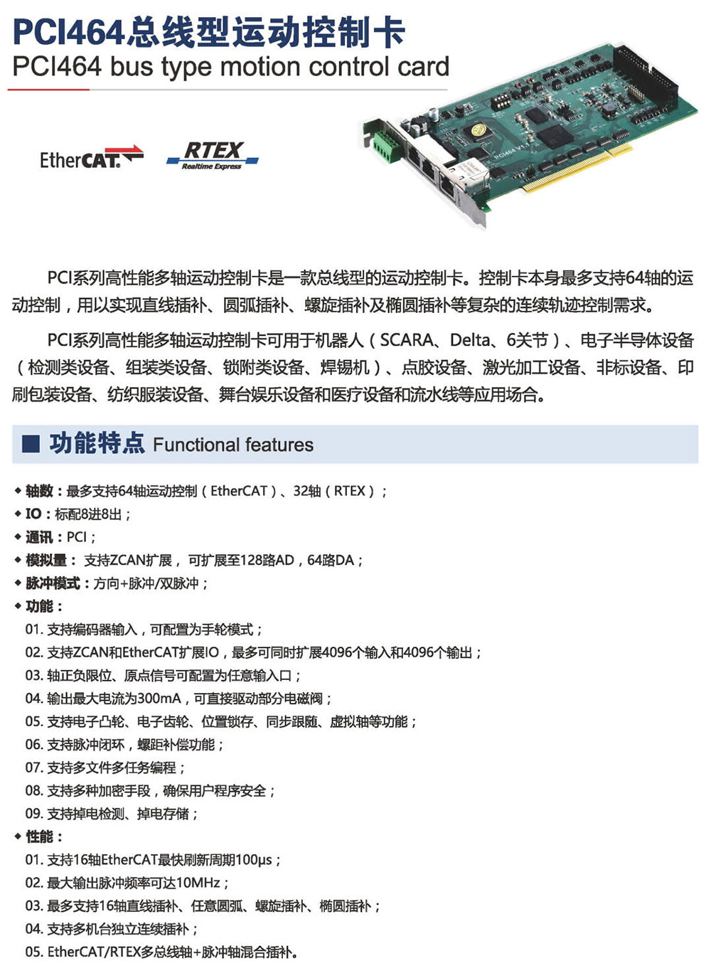 PCI系列高性能多軸運(yùn)動(dòng)控制卡是一款總線型的運(yùn)動(dòng)控制卡。 控制卡本身支持64軸的運(yùn)動(dòng)控制,用以實(shí)現(xiàn)直線插補(bǔ)、圓弧插補(bǔ)、螺旋插補(bǔ)及橢圓插補(bǔ)等復(fù)雜的連續(xù)軌跡控制需求。