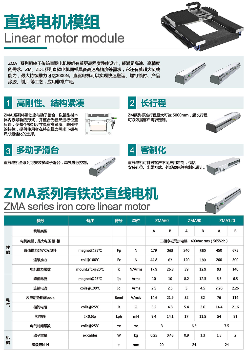 ZMA系列將滑動(dòng)座與動(dòng)子整合,以鋁型材本體內(nèi)嵌導(dǎo)軌的形式,并整合光柵尺進(jìn)行位置反饋,使整個(gè)模組尺寸具有高緊湊、高剛性的特性,提供使用者在特定推力需求下?lián)碛谐叽缱罴鸦倪x擇。