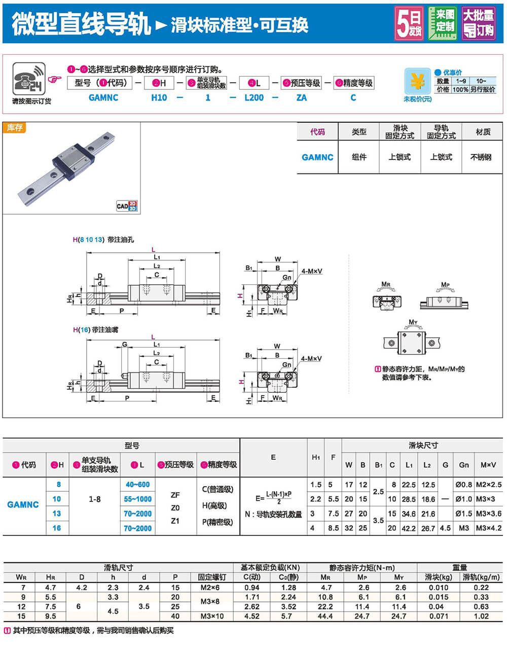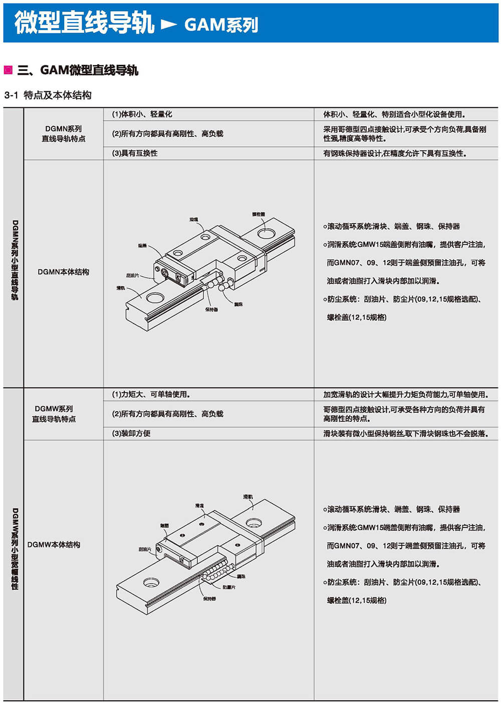 直線導軌由鋼珠在滑塊與滑軌之間作無限滾動循環(huán)負載平臺能沿著滑軌輕易地以高精度做線性運動。與傳統(tǒng)的滑動導引相比較滾動引導的摩擦系數(shù)可降低至1/50,由于啟動的摩擦力大大減少,相對的較少無效運動發(fā)生故而能輕易達到μum級進給及定位。在加上滑塊與滑軌的束制單元設計,使得線性導軌可同時承受上下左右等各個方向的負荷上述陳列特點并非傳統(tǒng)滑動導引所能比擬因此機臺若能配合滾珠螺桿,使用線性導軌作導引必能大幅提高設備精度與機械效能。