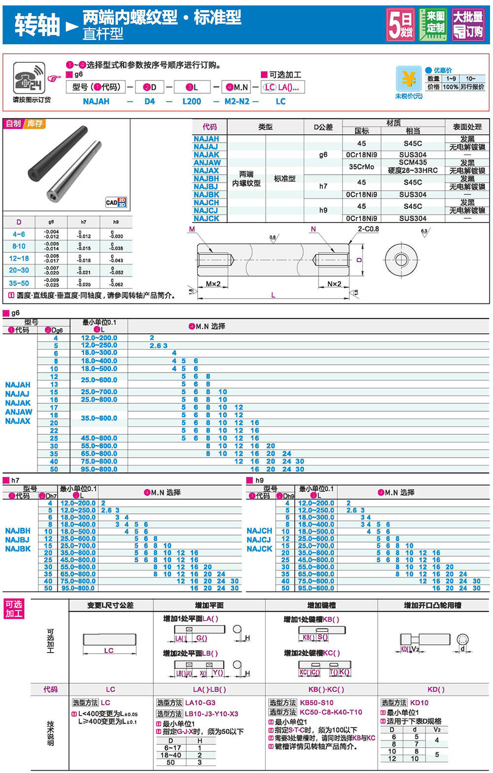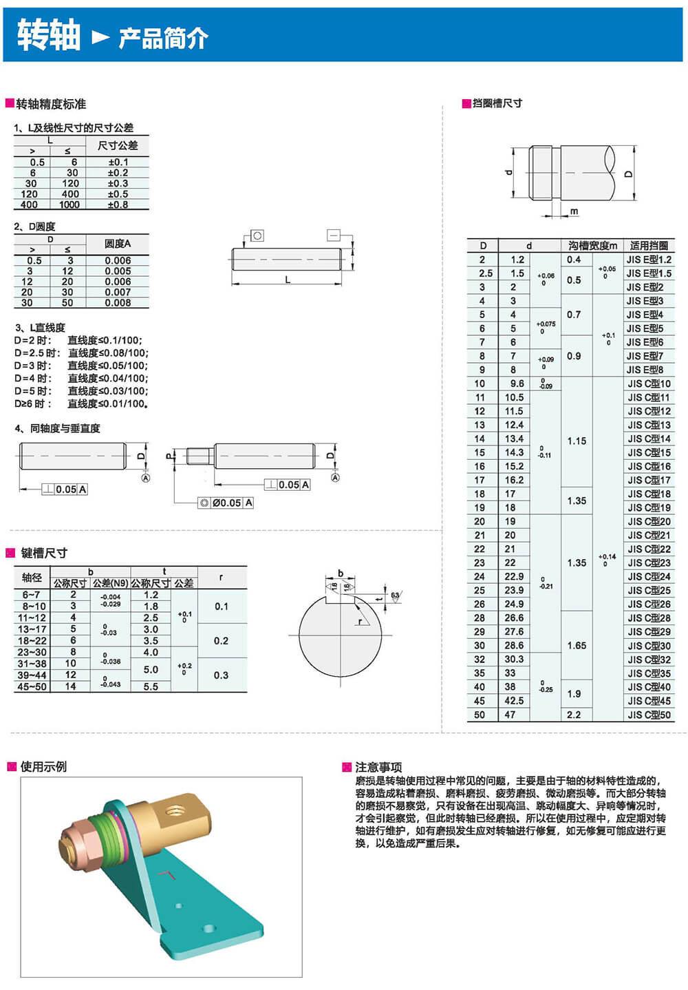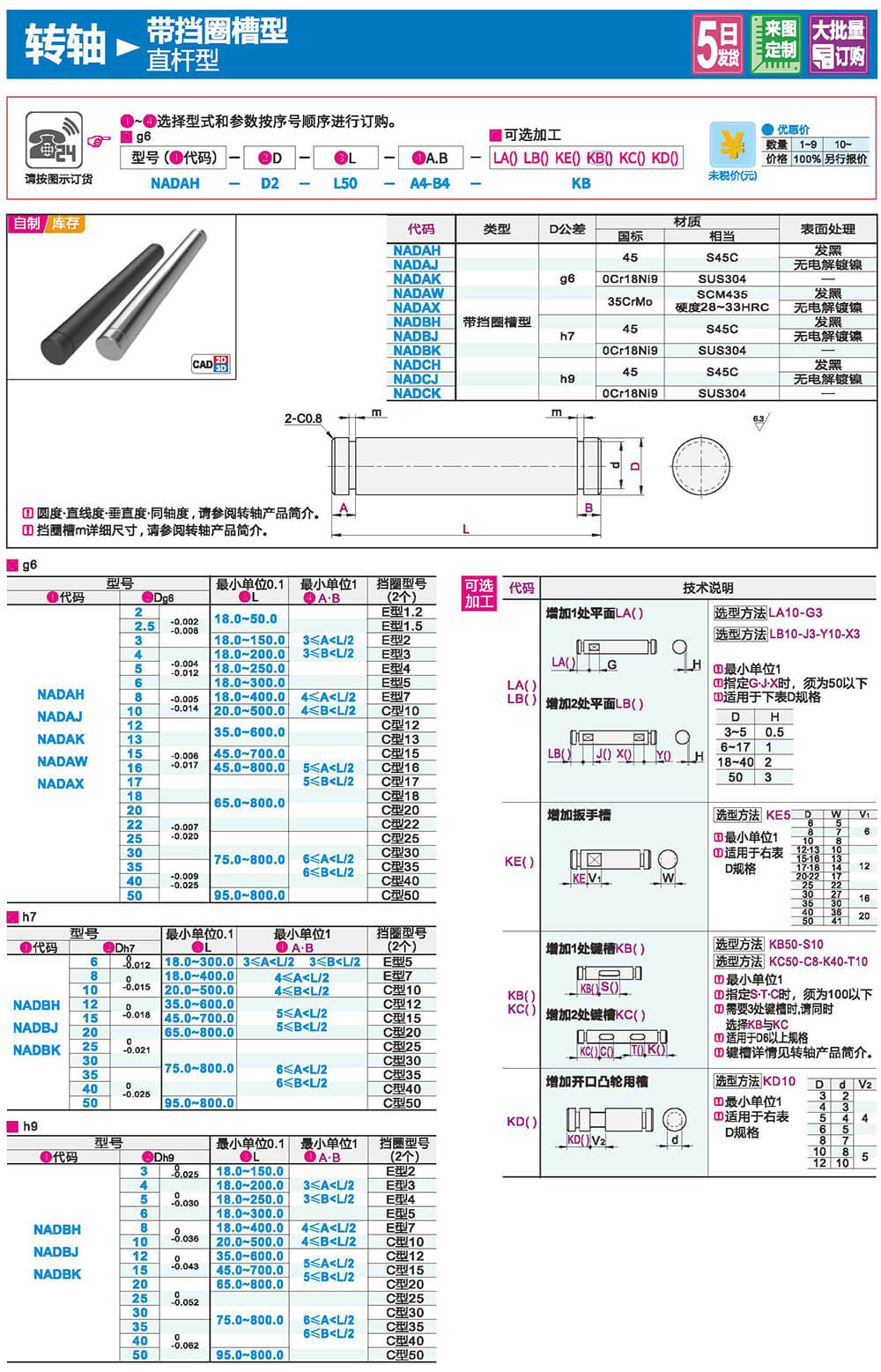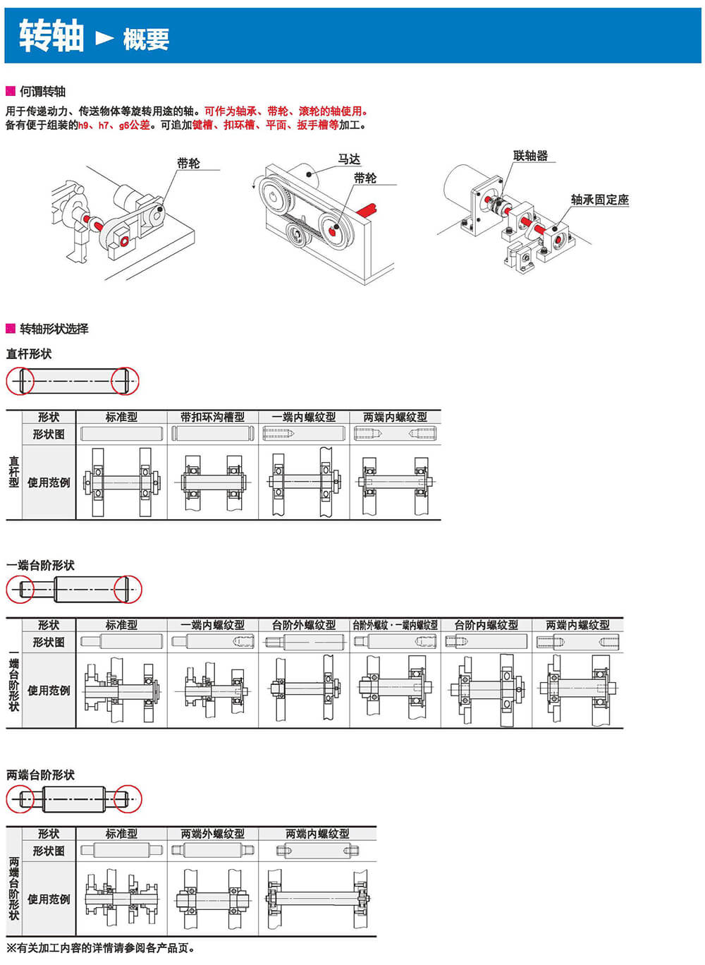 用于傳遞動(dòng)力、傳送物體等旋轉(zhuǎn)用途的軸。可作為軸承、帶輪、滾輪的軸使用。 備有便于組裝的h9、h7。g6公差??勺芳渔I槽、扣環(huán)槽。平面、扳手槽等加工。