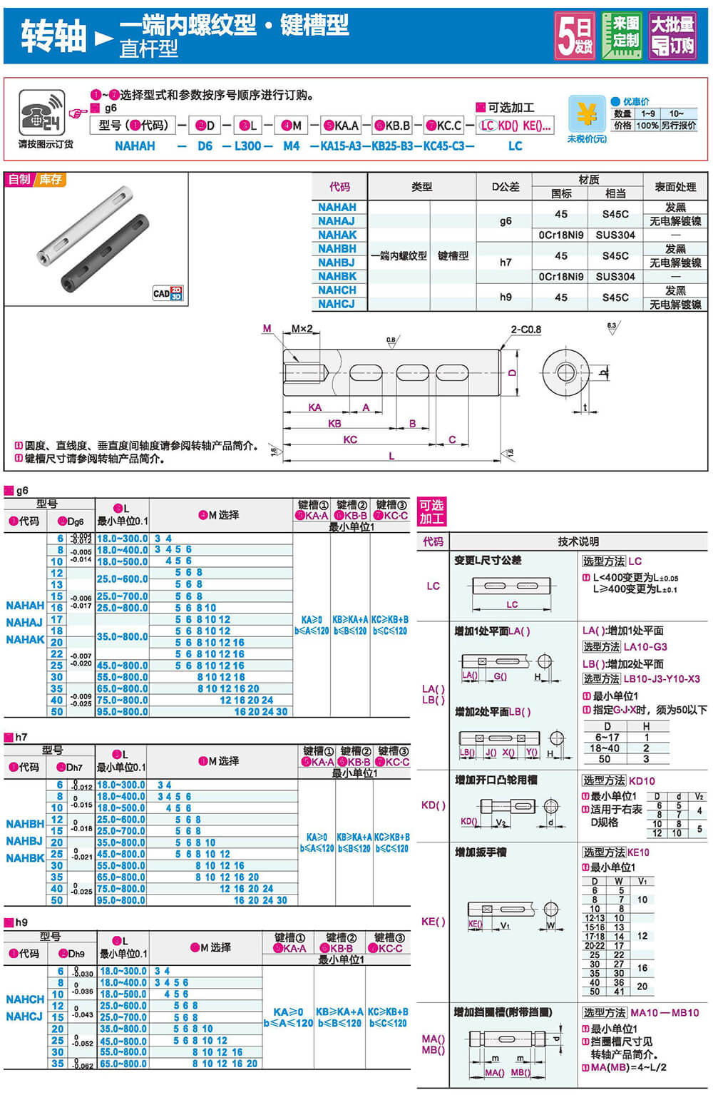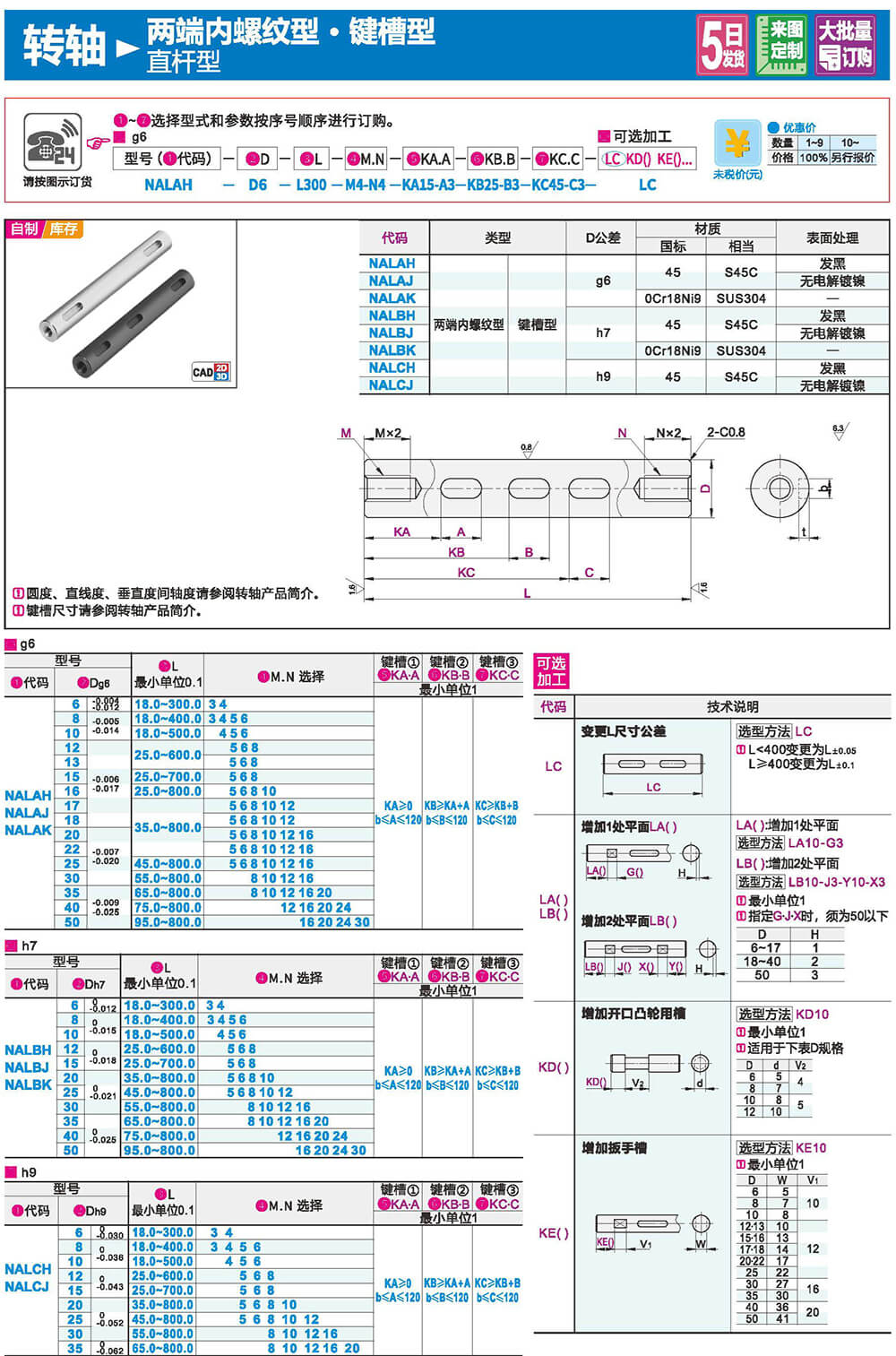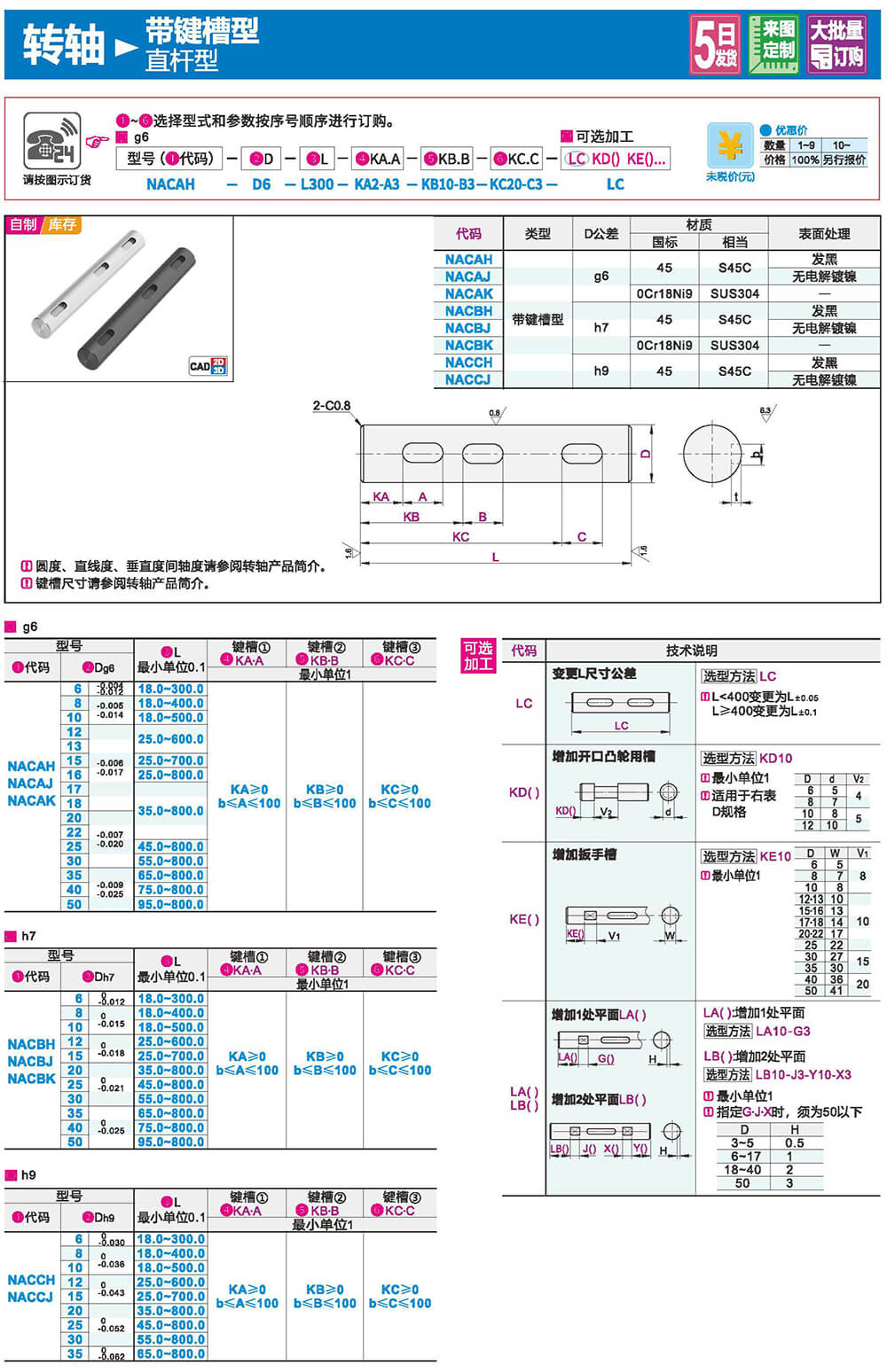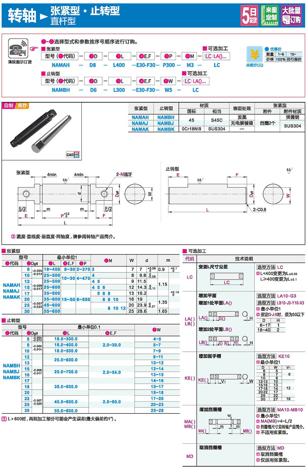 用于傳遞動(dòng)力、傳送物體等旋轉(zhuǎn)用途的軸。可作為軸承、帶輪、滾輪的軸使用。 備有便于組裝的h9、h7。g6公差??勺芳渔I槽、扣環(huán)槽。平面、扳手槽等加工。